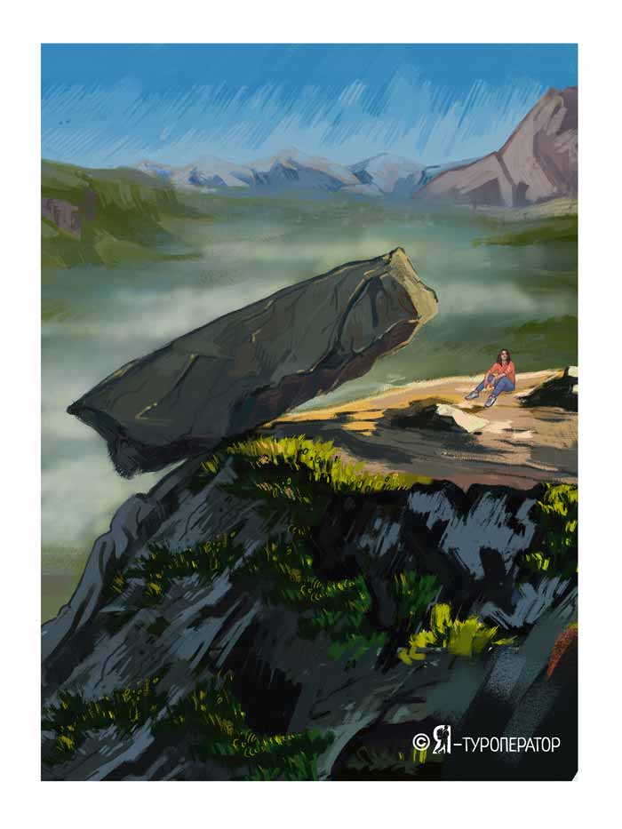 Скала «Висячий камень» - центральный объект на маршруте. Название его появилось не случайно: дело в том, что это действительно огромный камень, который стоит на краю, как бы нависая над озером «Радужное». Если смотреть снизу, от самого озера, то создается впечатление, что камень вот-вот сорвется и со страшным грохотом обрушится вниз. У камня вас ждёт еще одна запланированная остановка на отдых и, конечно фото.