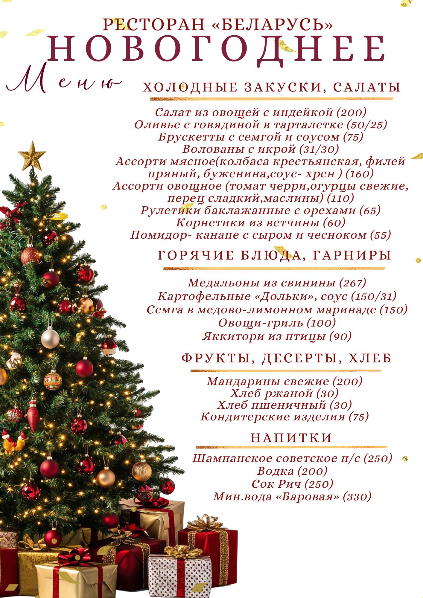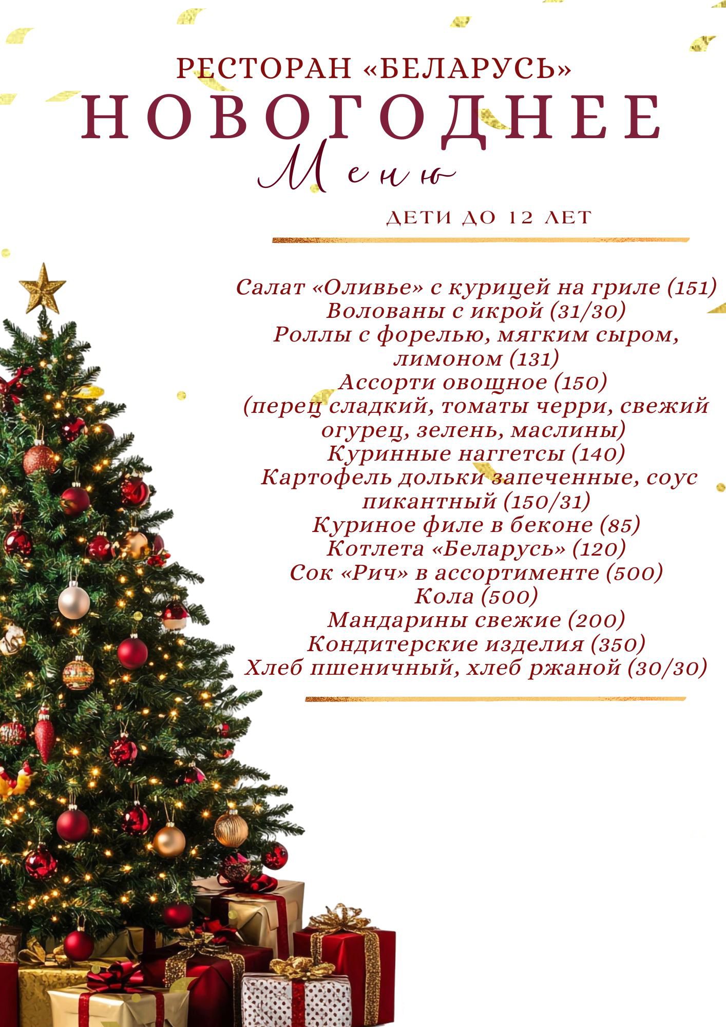 Вечером - Новогодний банкет в ресторане гостиницы "Беларусь" (по желанию за доп. плату)**. Встретьте новый 2026 год в атмосфере волшебства и праздничного веселья! Для вас этим праздничным вечером: программа с харизматичным ведущим, яркое выступление самобытного цыганского коллектива «ОТРАДА», выступление танцевального коллектива «KVADI BAND», живой вокал и дискотека с любимыми хитами и новогодними мелодиями наполненное страстью и темпераментом! И, конечно же, поздравления от главных героев новогодней ночи – Деда Мороза и его внучки Снегурочки! С меню банкета для взрослых можно ознакомиться здесь, с меню для детей здесь.